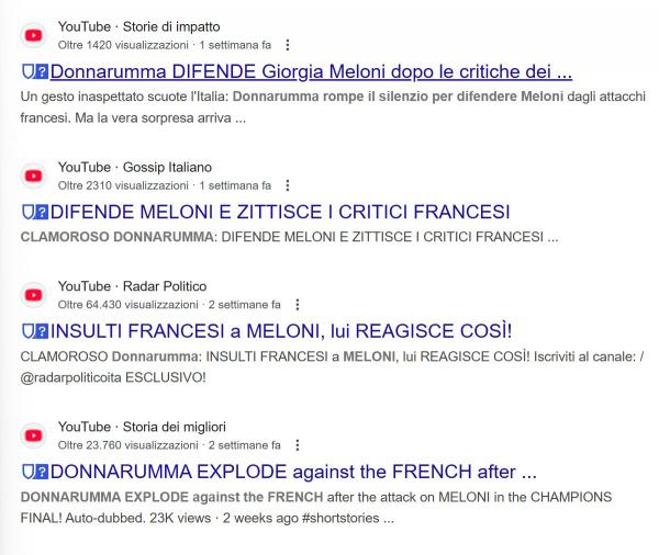 Clicco sul link, vedo il video che mi ha segnalato. Il canale che lo diffonde si chiama VIRALE (meno di 2500 iscritti), ma il video ha già superato le 85mila visualizzazioni. Chiaramente realizzato con IA, non è altro che un mix di immagini statiche con testo, in cui si sostiene che il calciatore Donnarumma abbia difeso Giorgia Meloni da alcuni attacchi della stampa francese al termine della finale di Champions League.