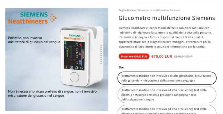 Nella pagina viene proposto un glucometro marca Siemens al prezzo scontato di 70 euro invece che 140. La descrizione del prodotto dice: