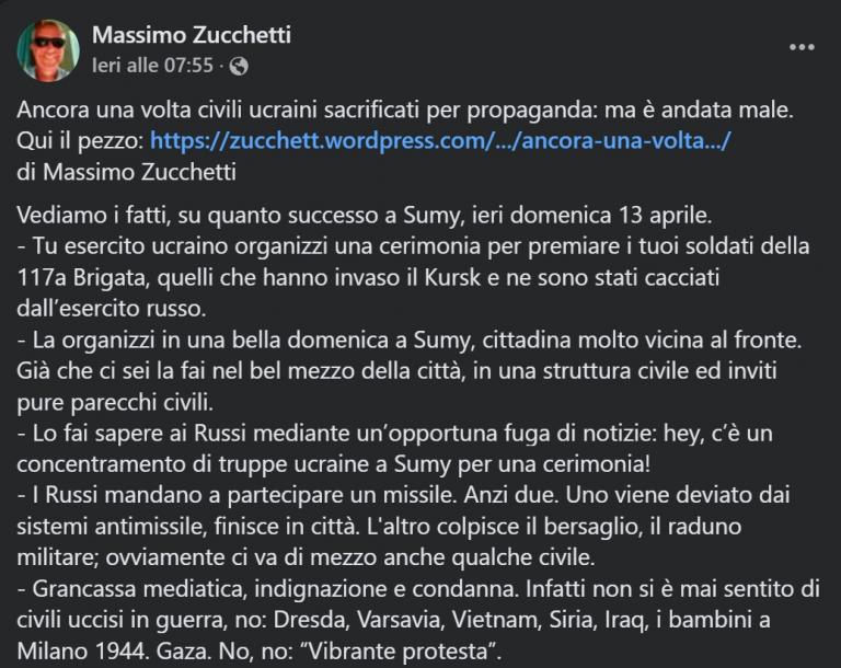 Ci è stato segnalato un lunghissimo post su una pagina social, un post che porta la firma del professor Massimo Zucchetti, che già in passato si era scagliato contro l’Ucraina; il post lo trovate qui.